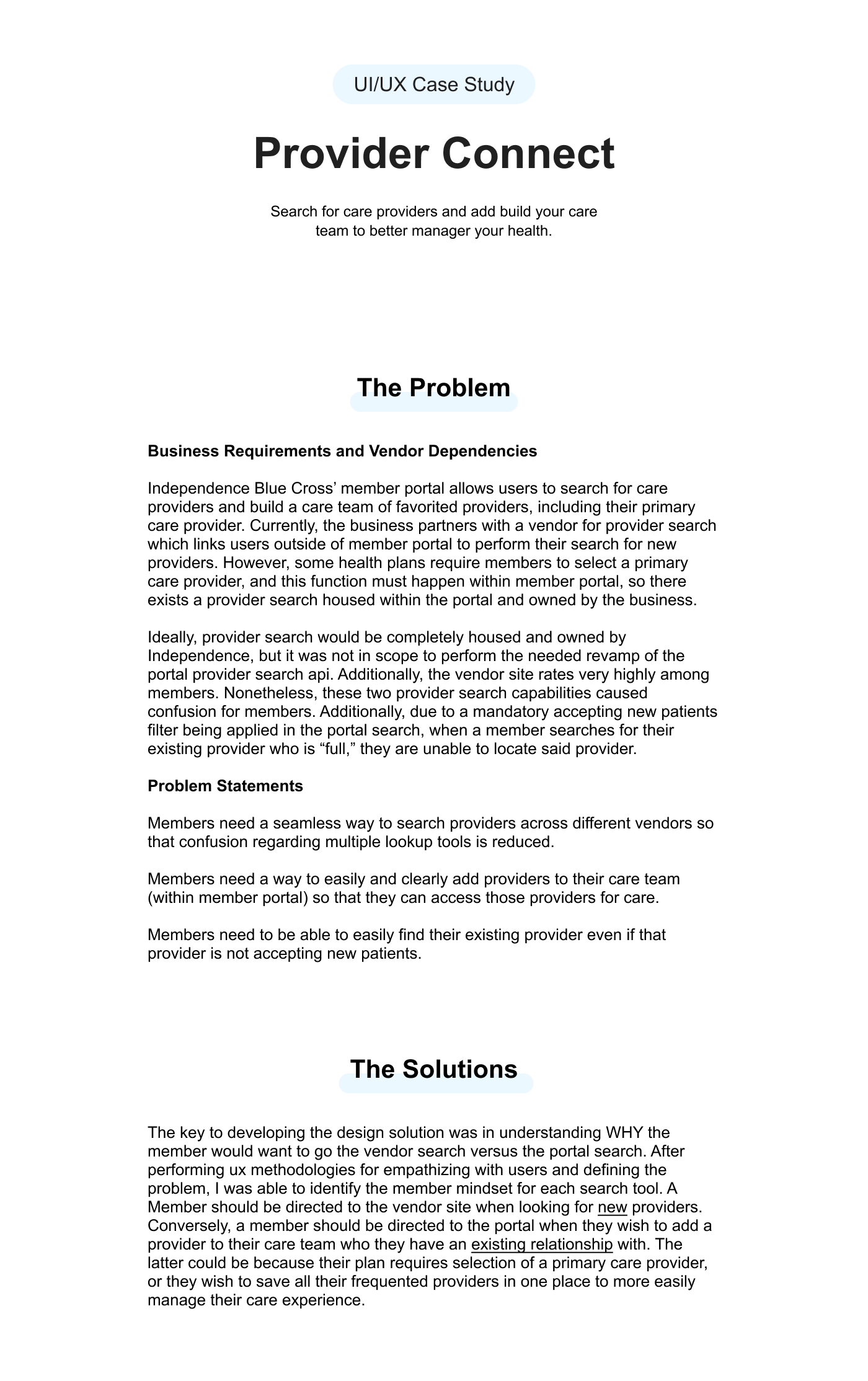 Synthesized two provider lookup and management tools to better direct users to which they need to use and create a more holistic provider connect.
